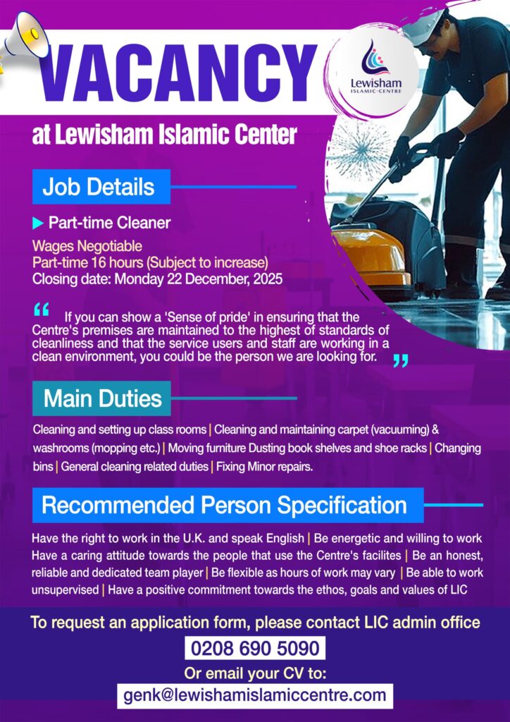 If you are interested, please email us your CV to genk@lewishamislamiccentre.com.