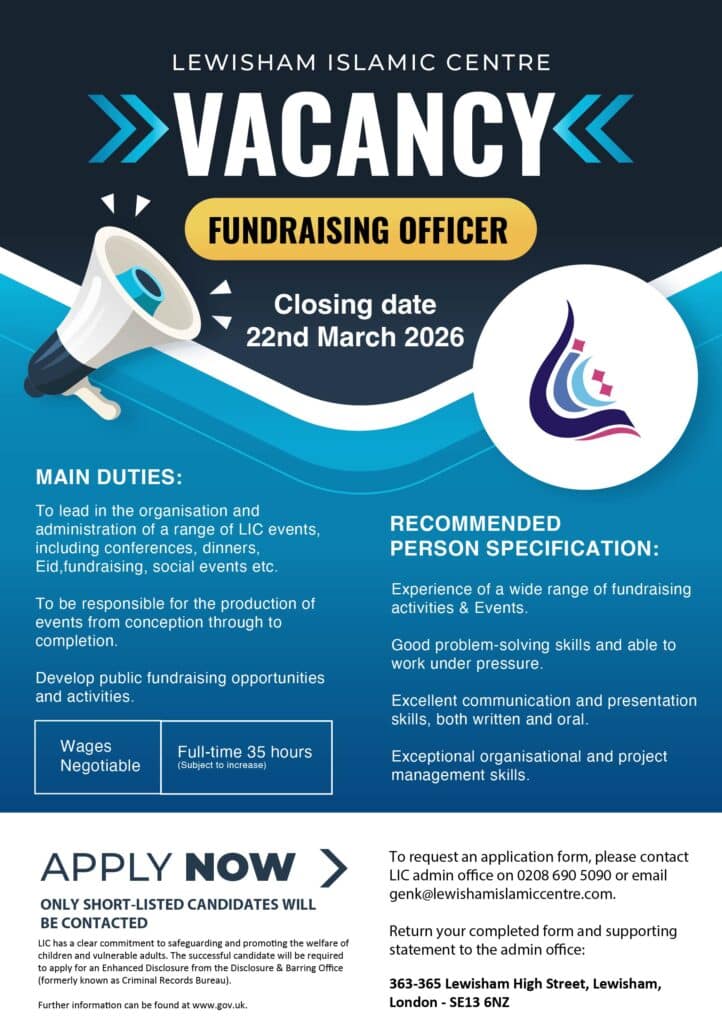 If you are interested, please email us your CV to genk@lewishamislamiccentre.com.