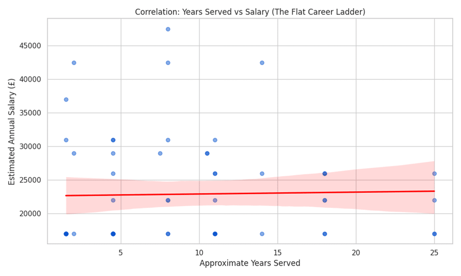 - Insightful Correlation: The findings suggest a very weak relationship between experience and pay (Chart 7 below). The ‘flat career ladder’ issue is a recurring concern, as an Imam with significant experience may earn a similar wage to a newcomer.