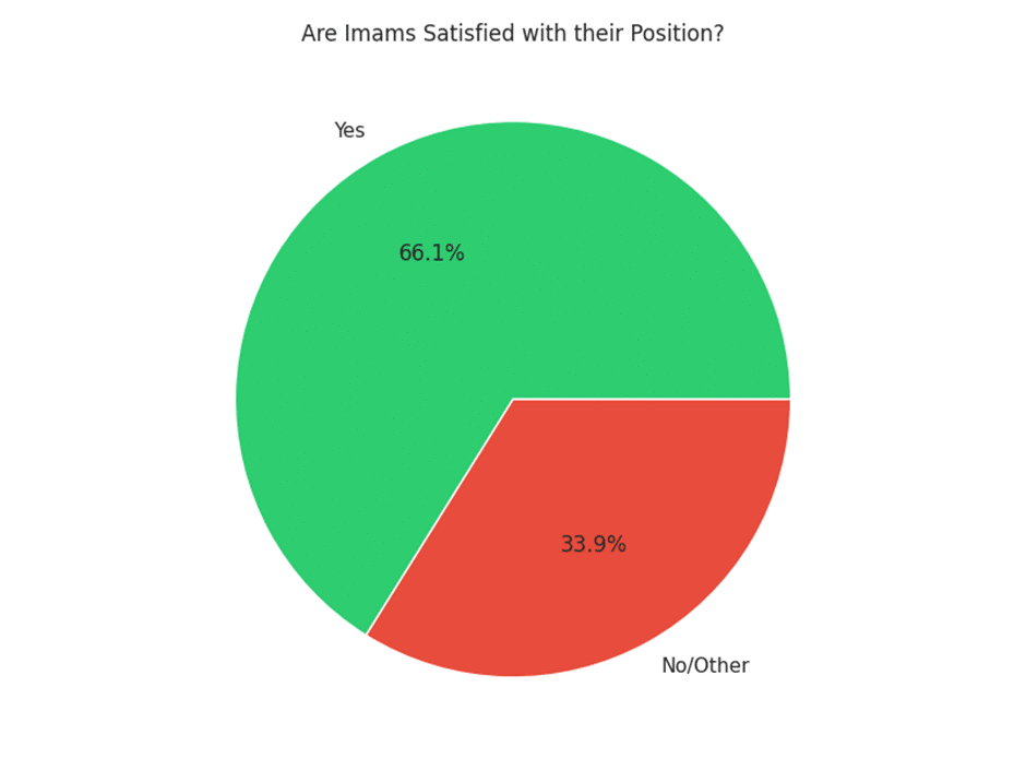 - Overall Satisfaction: 64.5% of Imams report being satisfied (Chart 2 below).
