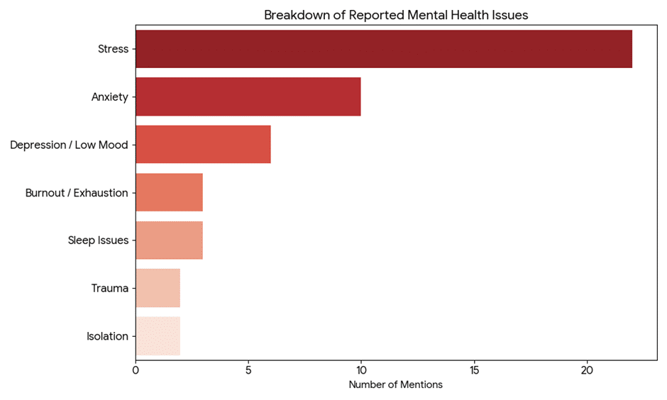 - Vicarious Trauma & Burnout: A small but significant group explicitly mentioned “Trauma” and “Burnout,” which is common in frontline roles where individuals absorb the crises of others.
