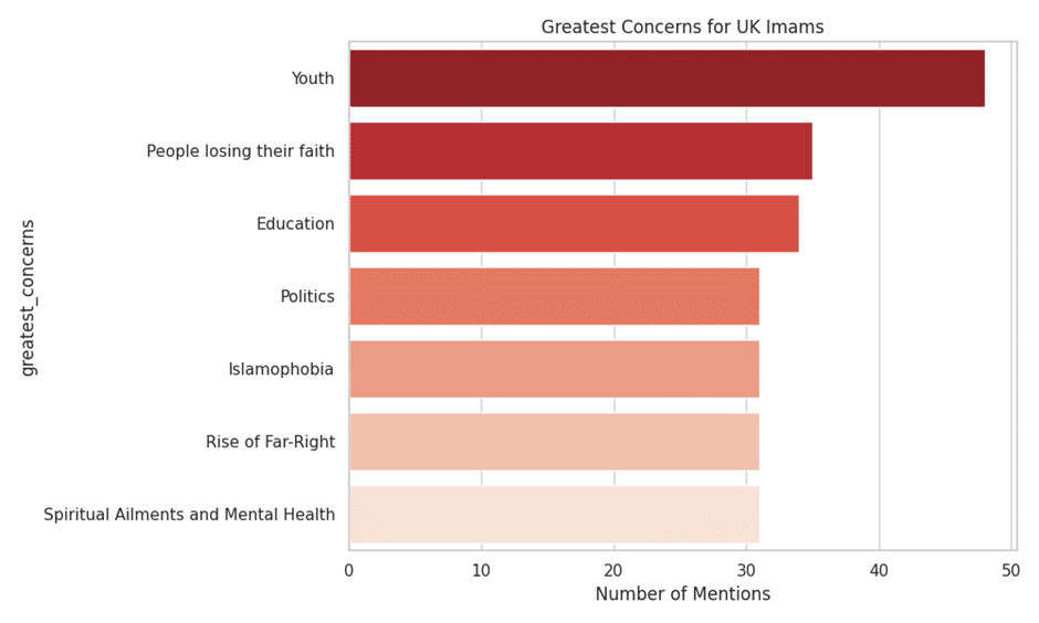 • Greatest Concerns: Youth (77.4%) is the primary concern by a wide margin, followed by Apostasy/Loss of Faith (56.5%) and Islamophobia (50%) (Chart 5 below).