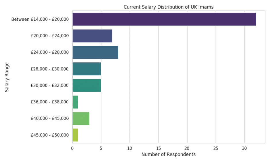 - The Salary Crisis: As seen in Chart 1 below (Salary Distribution), over 51% of Imams in this survey earn in the lowest bracket of £14,000–£20,000.