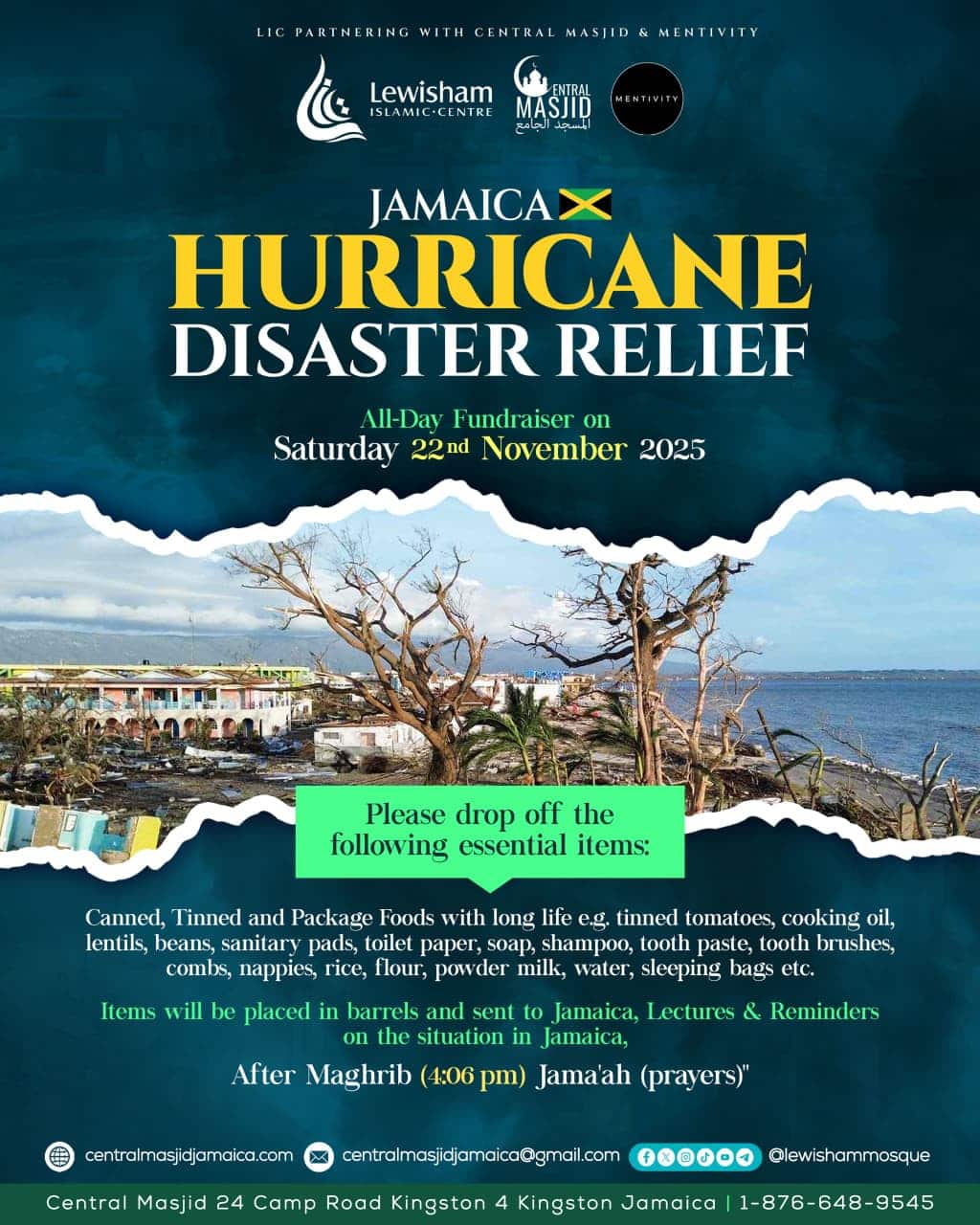 Jamaica Hurricane Disaster Relief Project with Central Masjid in Jamaica & Mentivity + Add to Google Calendar + iCal / Outlook export 00 days 00 hours 00 minutes 00 seconds Date 22nd Nov Time 12:00 - 18:00 Category Events Public Share this event