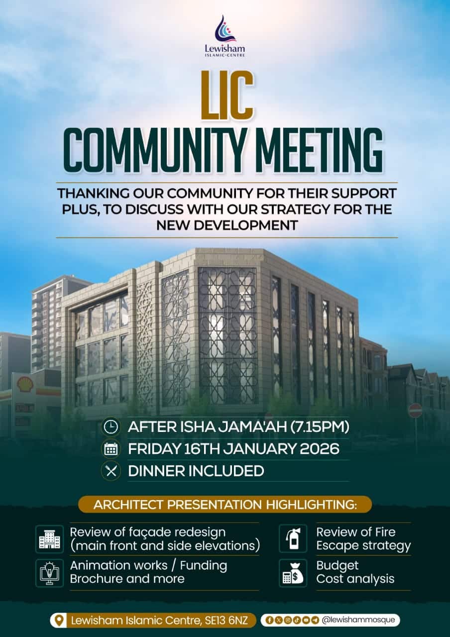 LIC Community Meeting on the New Development + Add to Google Calendar + iCal / Outlook export 00 days 00 hours 00 minutes 00 seconds Date 16th Jan Time 19:30 - 21:00 Category Imam Ashraf Imam Sabir Imam Shakeel Public Staff Share this event