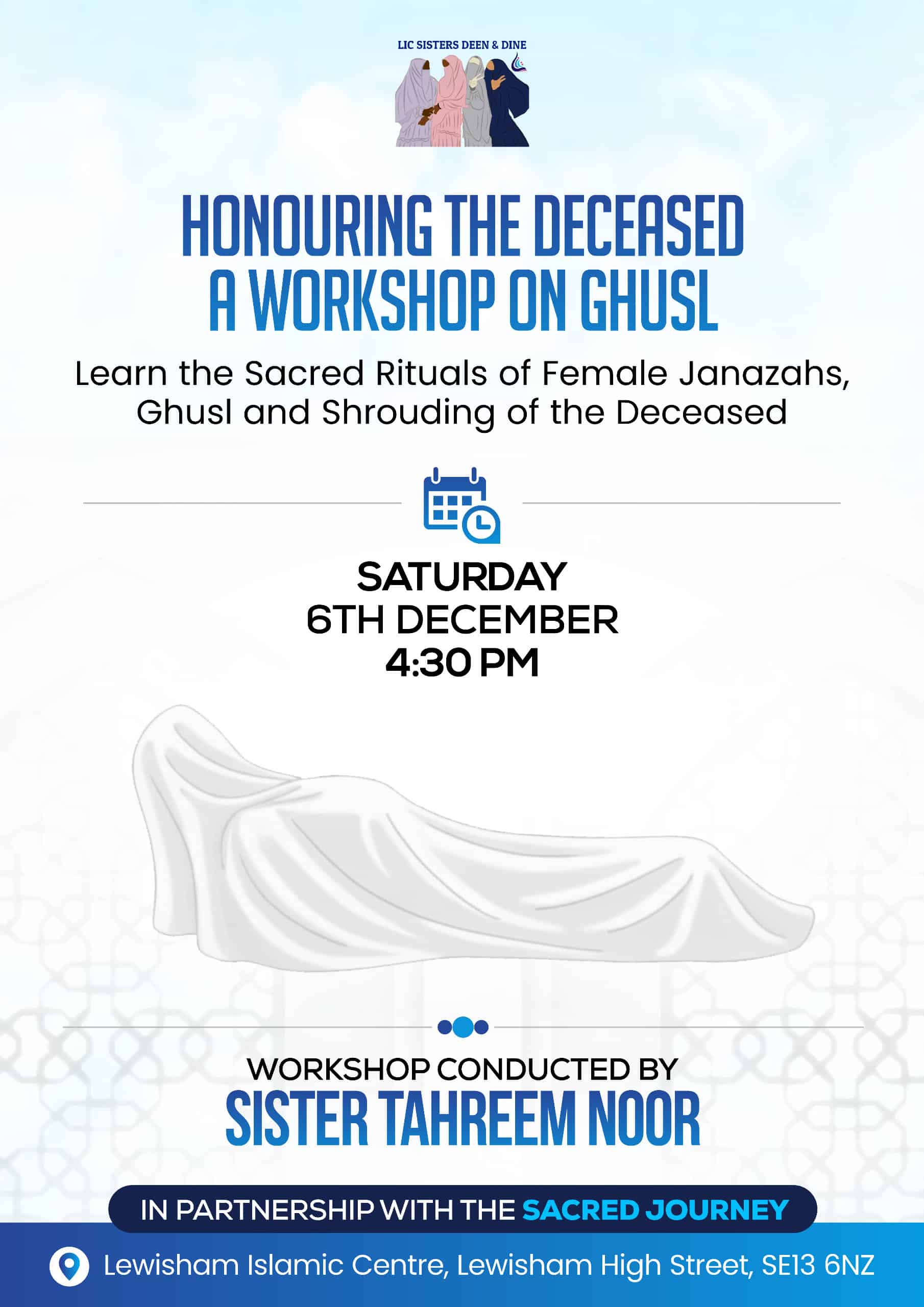 Sisters’ Deen and Dine – Ghusl Workshop + Add to Google Calendar + iCal / Outlook export Date 06th Dec Expired! Time 16:30 - 19:00 Category Imam Ashraf Imam Sabir Imam Shakeel Public Staff Share this event