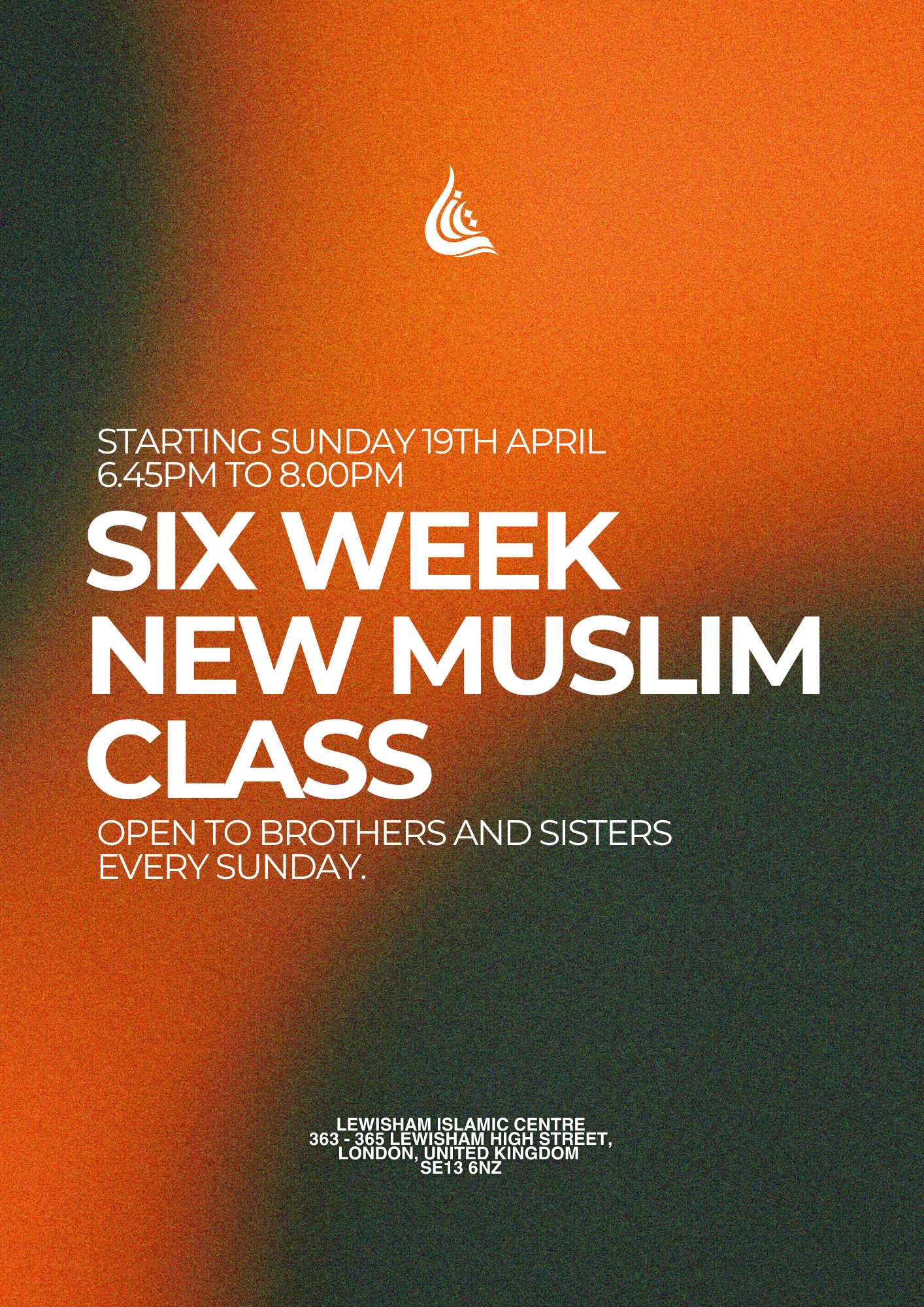 Six Week New Muslim Class + Add to Google Calendar + iCal / Outlook export 00 days 00 hours 00 minutes 00 seconds Date 19th Apr Time 18:45 - 20:00 Category Public Share this event